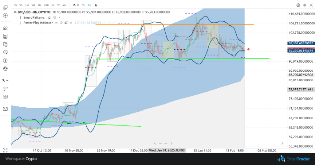 BTC/USD has a clear support around $95,000 (highlighted by the green line), while struggling to break above the $107,000 resistance zone.
