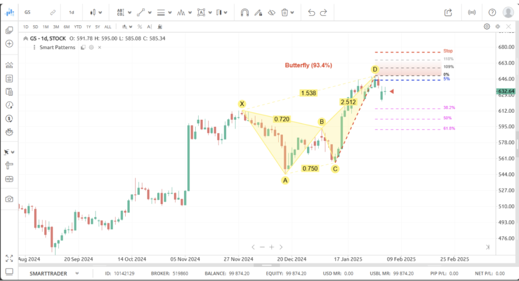 SmartTrader’s Smart Patterns tool, which automatically highlighted the butterfly pattern on GS, identifies these trade setups in real time, instantly marking the expected move, take-profit zones, and stop-loss levels.